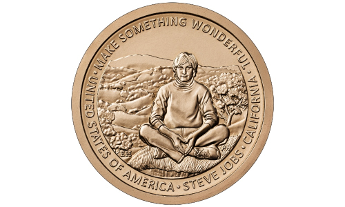This design presents a young Steve Jobs sitting in front of a quintessentially northern California landscape of oak-covered rolling hills. His posture and expression, as he is captured in a moment of reflection, show how this environment inspired his vision to transform complex technology into something as intuitive and organic as nature itself. Inscriptions are “UNITED STATES OF AMERICA” and “CALIFORNIA.” Additional inscriptions are “STEVE JOBS” and “MAKE SOMETHING WONDERFUL.”